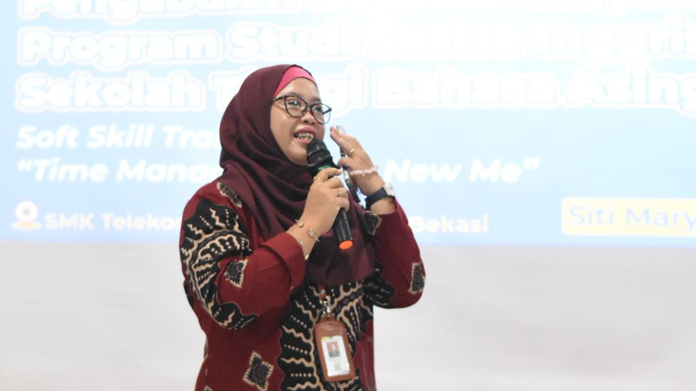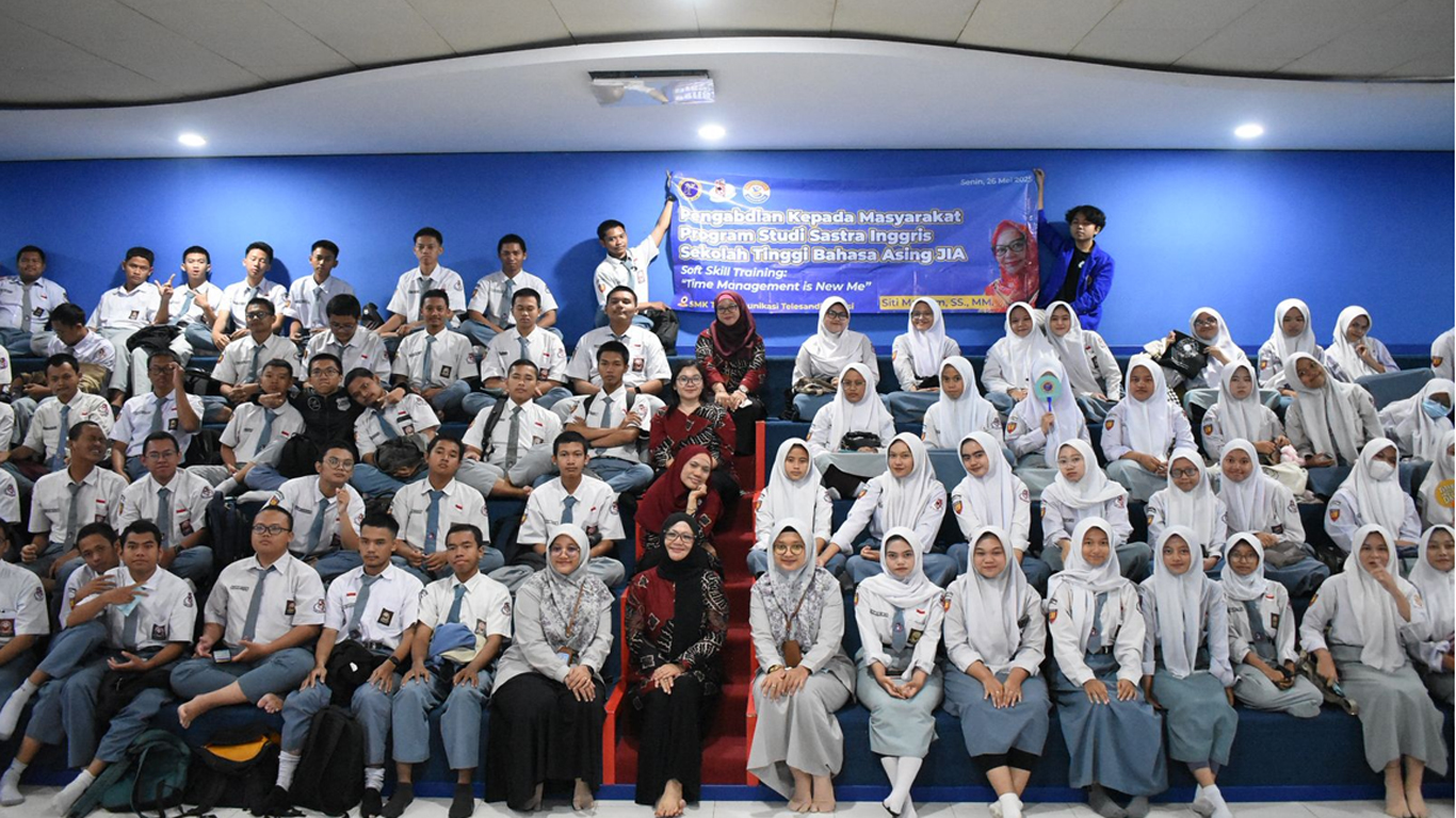 Kegiatan PKM oleh Prodi Sastra Inggris STBA JIA pada hari Senin, 26 Mei 2025 di ruang auditorium SMK Telekomunikasi Telesandi Bekasi telah dilaksanakan yang bertemakan “Soft Skill Training: Time Management is New Me”. Bentuk pengabdian kali ini diketuai oleh Yeni Noryatin, S.S., M.Hum. dengan beranggotakan Siti Maryam, S.S., M.M. selaku pemapar materi, Ade Surista, M.Pd., Inta Masni Sinaga, S.S., M.Hum. selaku dosen pendamping. Kedua mahasiswa yaitu Muhammad Ryan Fadhillah dan M. Davi Al Khairi sebagai panitia ikut serta dalam kegiatan PKM hari kedua ini selaku MC, moderator dan operator. Pertama-tama acara kembali dibuka oleh Muhammad Ryan Fadhillah selaku MC, moderator.