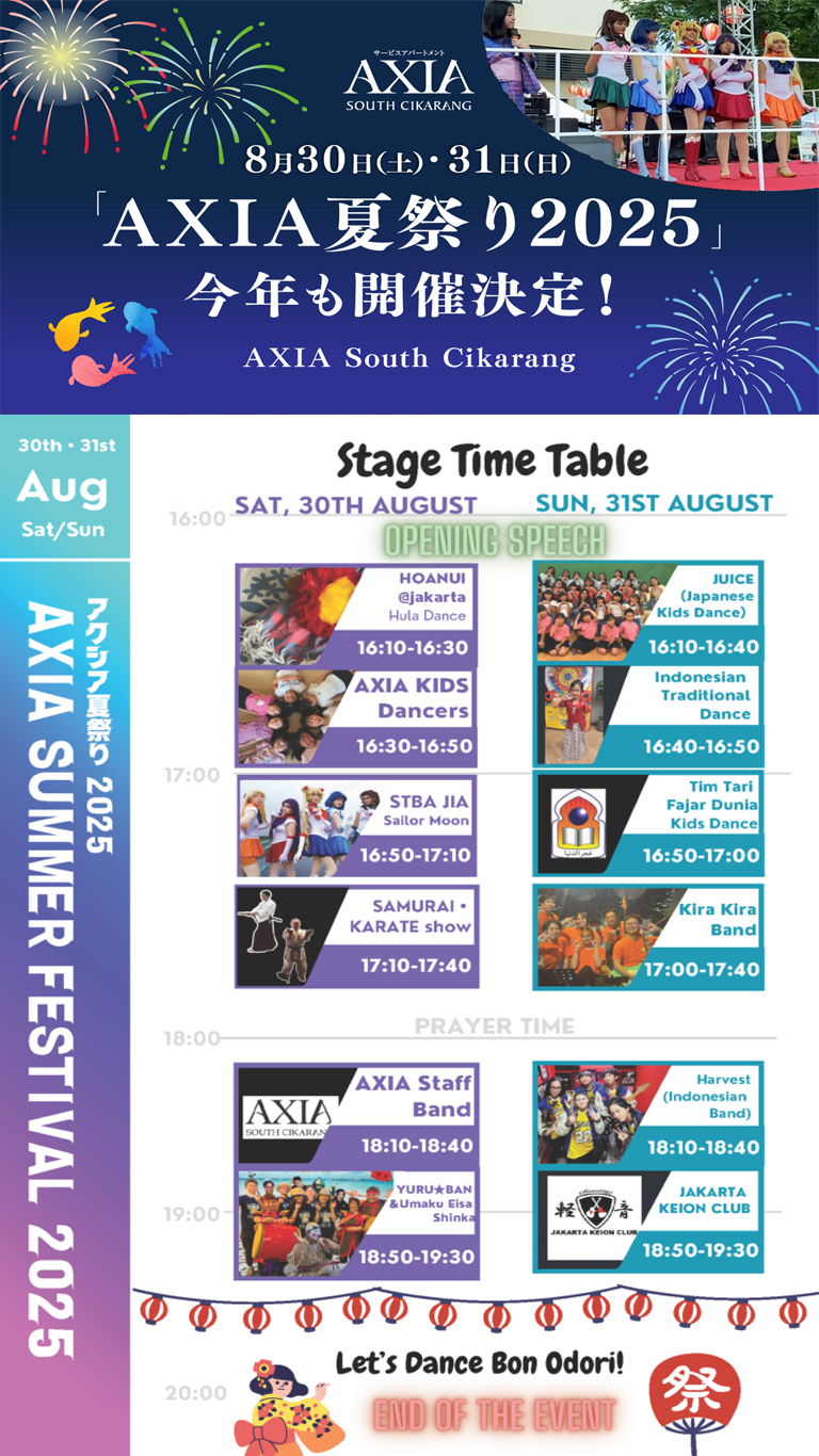Program Studi Sastra Jepang STBA JIA turut berpartisipasi dalam penyelenggaraan AXIA Summer Festival 2025 yang diselenggarakan oleh Hotel AXIA South Cikarang pada tanggal 30 dan 31 Agustus 2025. Menghadirkan nuansa khas matsuri, acara ini menjadi ruang bagi warga Jepang yang tinggal di Cikarang untuk merasakan semangat musim panas yang selama ini dirindukan. Acara ini pun menjadi wadah pembelajaran nyata bagi mahasiswa Program Studi Sastra Jepang STBA JIA.