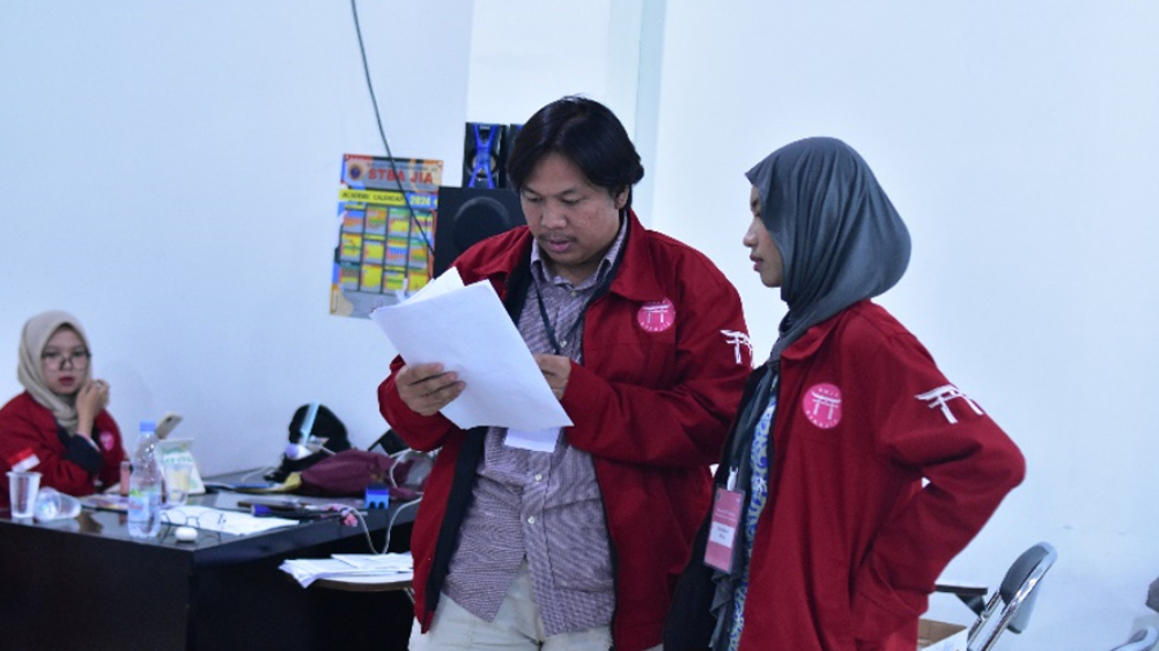 Proses pengecekan jawaban dan penilaian para peserta ujian simulasi JLPT oleh panitia