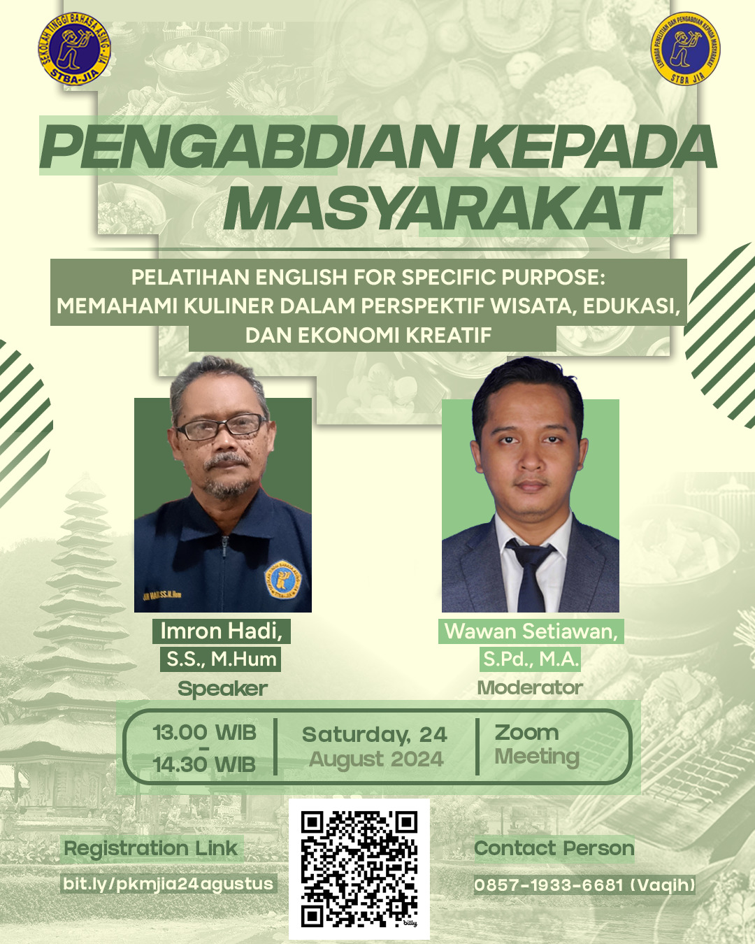 Dalam rangka pemenuhan kewajiban salah satu Tridharma dosen di bidang abdimas, STBA JIA Bekasi kembali melaksanakan Pengabdian kepada Masyarakat (PkM) pada hari Sabtu 24 Agustus 2024. Acara PKM pada kesempatan kali ini bertemakan wisata kuliner dari berbagai belahan daerah di tanah air. Dengan mengusung judul pengabdian Pelatihan English for Specific Purpose: Memahami Kuliner Dalam Perspektif, Wisata, Edukasi, dan Ekonomi Kreatif, acara pengabdian pada kesempatan kali ini diisi oleh Imron Hadi, S.S. M.Hum. selaku pemateri. Acara yang dilakukan secara daring dimulai pukul 13.00 turut melibatkan elemen mahasiswa sebagai pihak yang membantu di belakang layar demi kelancaran acara.