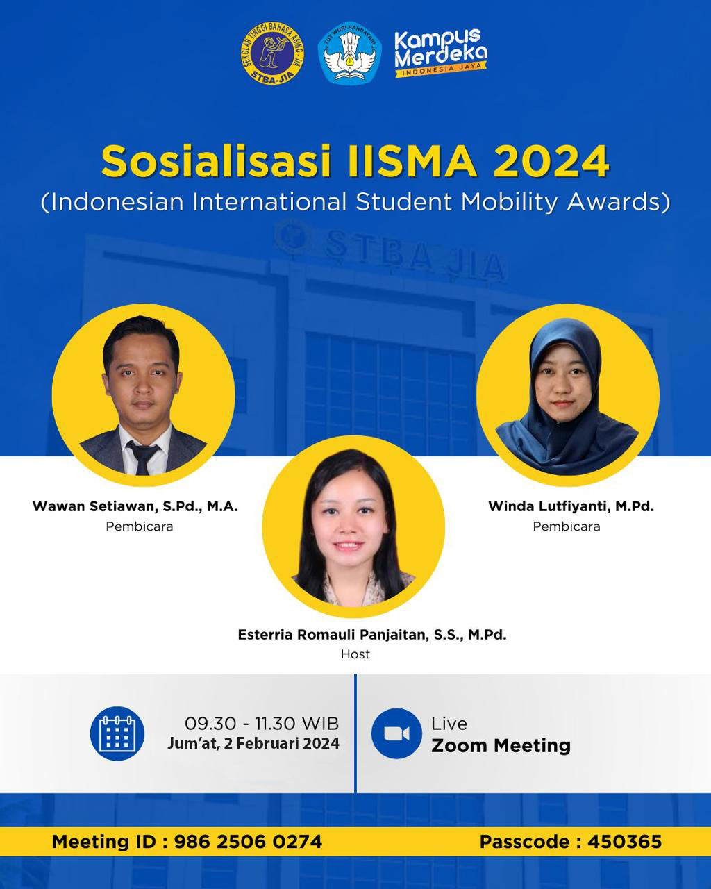 Sehubungan dengan pelaksanaan IISMA (Indonesian International Student Mobility Awards) 2024 yang merupakan salah satu program unggulan Kampus Merdeka, KUI (Kantor Urusan Internasional) STBA JIA telah mengadakan rangkaian kegiatan untuk memfasilitasi mahasiswa yang berpartisipasi pada program ini. IISMA adalah program beasiswa yang memberikan mahasiswa Indonesia kesempatan untuk belajar di perguruan tinggi luar negeri ternama selama satu semester atau 4-6 bulan. Sebagai awalan, KUI mengadakan rapat internal dengan pejabat struktural STBA JIA seperti Pak Ali Khamainy, S.T., M.M. (Ketua STBA JIA), Pak Dr. Rainhard Oliver, S.S., M.Pd. (Waket 1 Bidang Kurikulum), dan Pak Onin Najmudin, M.Hum. (Waket 3 Bidang Kemahasiswaan) untuk membahas timeline persiapan IISMA 2024 dan konversi kurikulum.