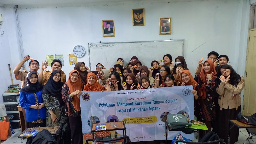Sebagai wujud dari Tridarma Perguruan Tinggi, salah satu bentuk kegiatan yang dilakukan adalah melaksanakan kegiatan pengabdian kepada masyarakat (PKM). Oleh karena itu, Program Studi Bahasa Jepang (S1) STBA JIA Bekasi telah melaksanakaan kegiatan yang berhubungan dengan pengabdian kepada masyarakat berupa pelatihan dengan tema Pembuatan Kerajinan Tangan dengan Inspirasi Makanan Jepang. Kegiatan PKM ini diadakan berkerja sama dengan SMAN Mutiara 17 Agustus pada hari Jumat, 26 Januari, Pukul 14.00.
