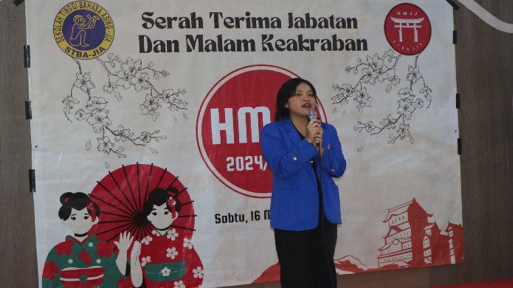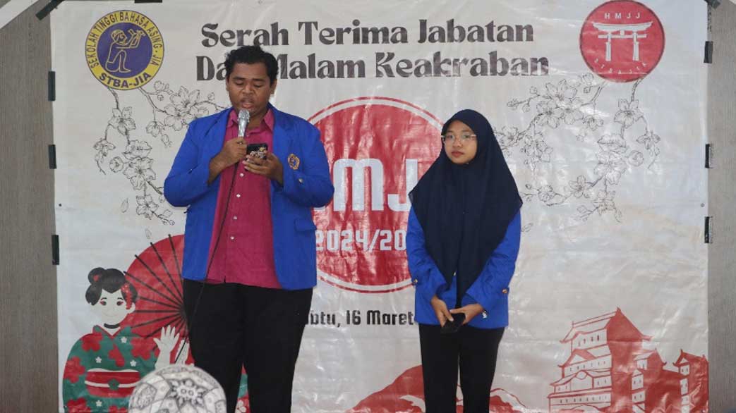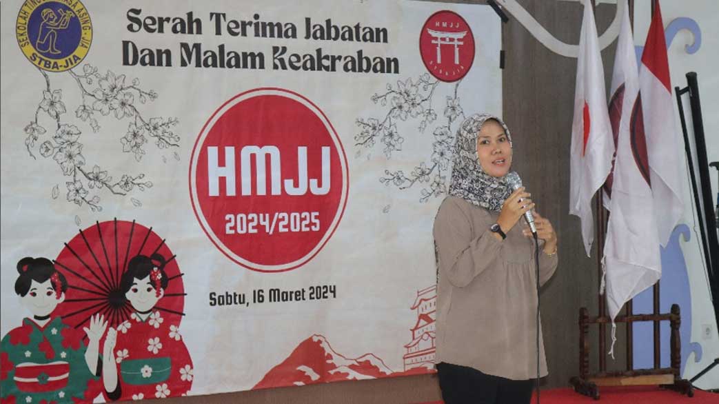 Sehubungnya dengan berakhirnya masa jabatan Himpunan Mahasiswa Jepang JIA (HMJJ) periode 2022/2023 maka dilakukan serah terima jabatan serah terima jabatan (SERTIJAB) dari pengurus lama kepada pengurus yang baru pada hari Sabtu, 16 Maret 2024 di aula Tokyo STBA JIA. Kegiatan ini dihadiri oleh seluruh pengurus HMJJ periode 2024/2025 dan perwakilan pengurus HMJJ periode 2022/2023, dan pelantikan dipimpin langsung oleh Kaprodi, Ibu Rahayu Aprilianti, S.S, M.Pd.